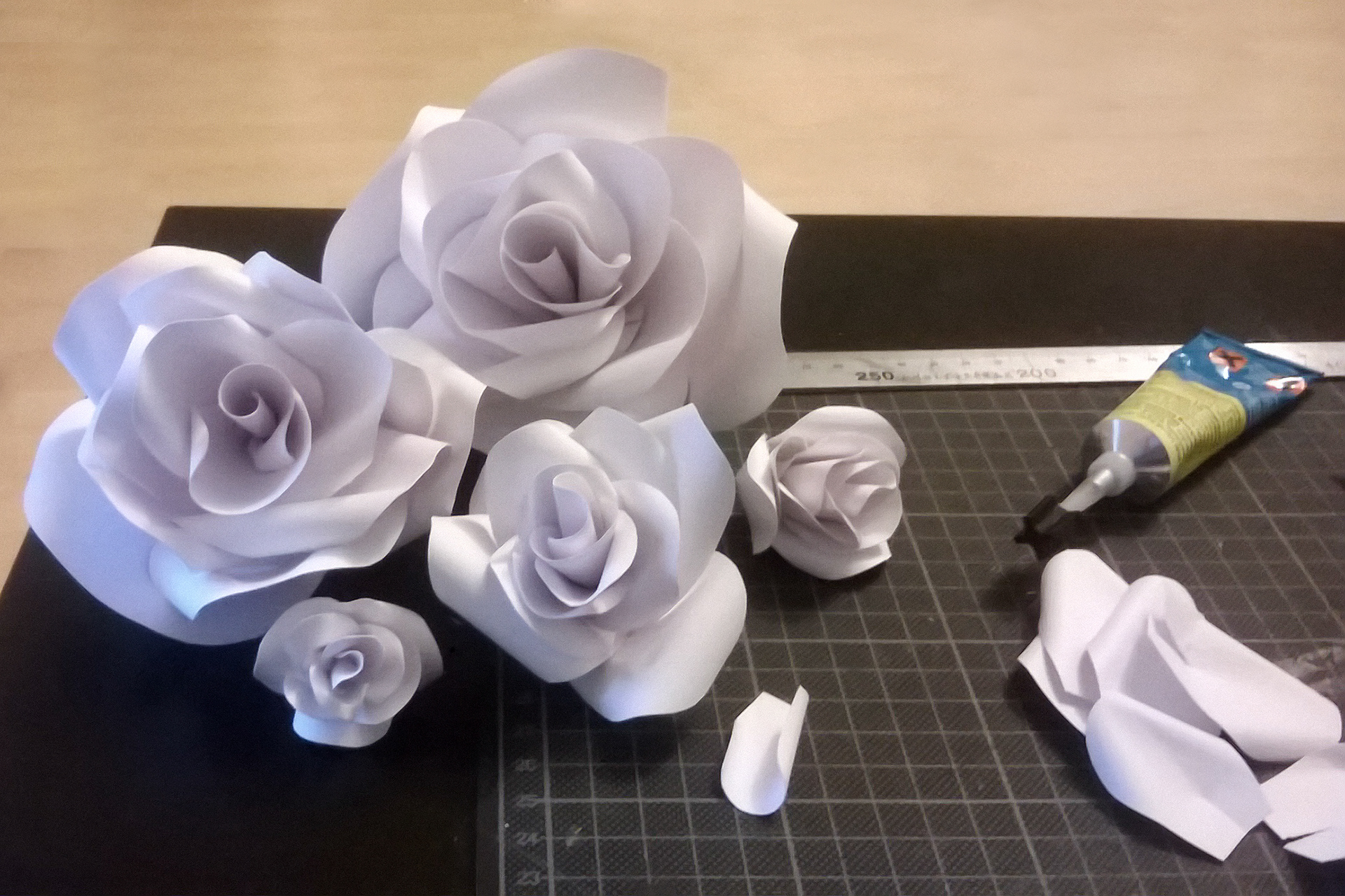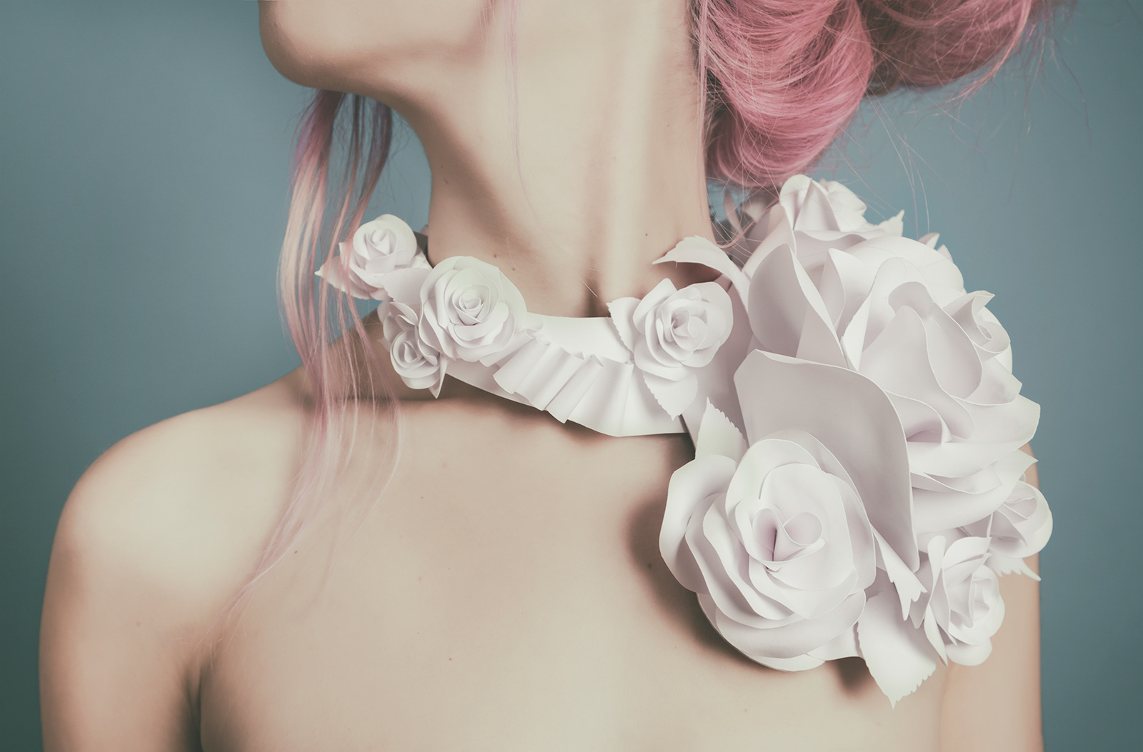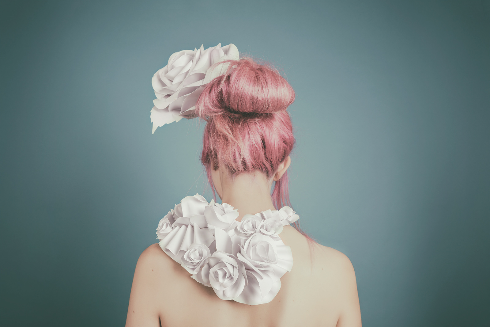 White roses shoulder pad and headband I made with paper, cardboard and glue.